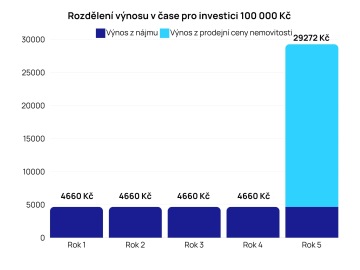 Na rozložení plateb pro tento příklad se můžete podívat do grafu. Poslední výplata (129 272 Kč) je reálně rozdělena na dvě - vrací se vstupní investice 100 000 Kč (není v grafu) a k ní se přičte 24 612 Kč jako výnos z prodeje a 4 660 Kč jako výnos z nájmu. Investice 100 000 Kč může tedy za 5 let vzrůst na 147 918 Kč a zvýšit se tak cca o polovinu.