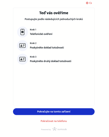 Systém si sám vyžádá ověření Vaší identit. Pro ověření Vám stačí mít u sebe mobilní telefon a 2 doklady s fotkou. Určitě potřebujete občanský průkaz. Jako druhý si můžete vybrat pas nebo řidičský průkaz.
